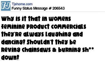 - # 206050 Not that I expect 100% truth in advertising, but shouldn’t those women in the tampon commercials be wielding chainsaws, laying asphalt, or driving semi trucks and not laughing, swimming and dancing?