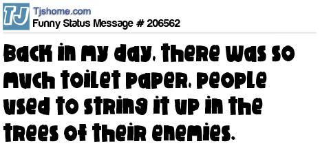 - # 207965 Back in my day we had so much toilet paper and eggs that we would throw them at the houses of our enemies.
