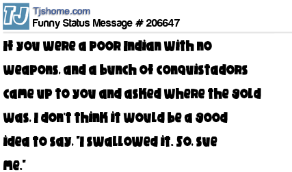 X says If you were a poor Indian with no weapons, and a bunch of conquistadors came up to you and asked where the gold was, I don't think it would be a good idea to say, "I swallowed it. So, sue me."