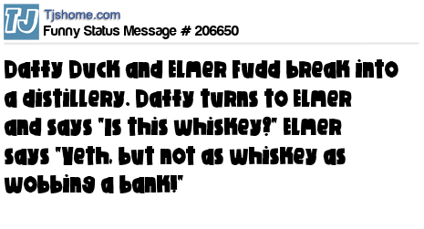 X says Daffy Duck and Elmer Fudd break into a distillery. Daffy turns to Elmer and says "Is this whiskey?" Elmer says "Yeth, but not as whiskey as wobbing a bank!"
