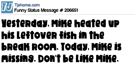 X says Yesterday, Mike heated up his leftover fish in the break room. Today, Mike is missing. Don't be like Mike.