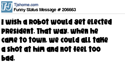 X says I wish a robot would get elected president. That way, when he came to town, we could all take a shot at him and not feel too bad.