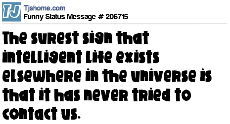 - # 24853 Why do we spend so much time looking for intelligent life on other planets? I'd be happy to find intelligent life here on Earth first.