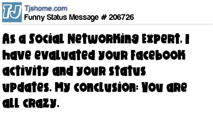 - # 210796 As a Social Networking Expert, I have evaluated your social media activity and your status updates. My conclusion: You're all crazy.