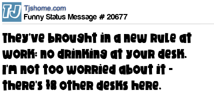 X They've brought in a new rule at work: no drinking at your desk. I'm not too worried about it - there's 78 other desks here.