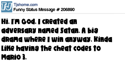 X says Hi. I'm God. I created an adversary named Satan. A big drama where I win anyway. Kinda like having the cheat codes to Mario 3.