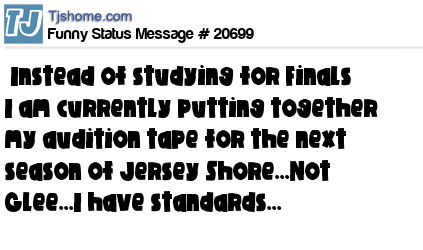 X is Instead of studying for Finals I am currently putting together my audition tape for the next season of Jersey Shore...Not Glee...I have standards...