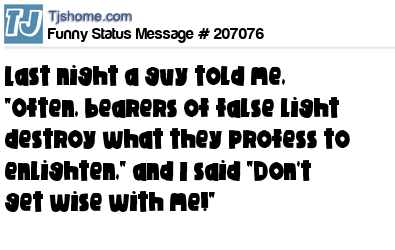 X says Last night a guy told me, "Often, bearers of false light destroy what they profess to enlighten," and I said "Don't get wise with me!"