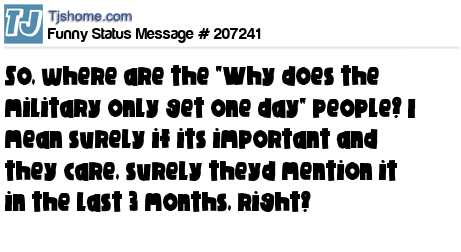 X says So, where are the "Why does the military only get one day" people? I mean surely if its important and they care, surely theyd mention it in the last 3 months, right?