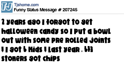 X says 2 years ago I forgot to get halloween candy so I put a bowl out with some pre rolled joints ! I got 6 kids ! Last year , 673 stoners got chips