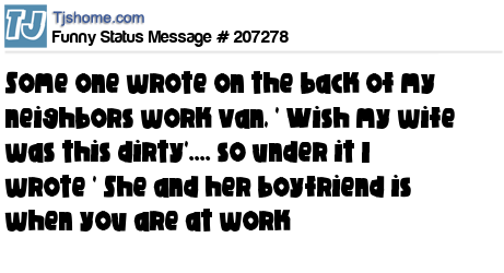- # 15659 I was walkin past my neighbours white van that was covered in dirt ,someone had wrote on it, "I wish my wife was as dirty as this van." I just couldn't help myself from writing, " She is... When your at work