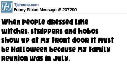 - # 172217 When people dressed like witches, strippers and hobos show up at my front door it must be Halloween because my family reunion was in July.
