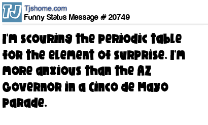 X I'm scouring the periodic table for the element of surprise. I'm more anxious than the AZ Governor in a Cinco de Mayo parade.