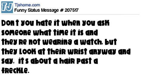 X says Don’t you hate it when you ask someone what time it is and they’re not wearing a watch, but they look at their wrist anyway and say, “it’s about a hair past a freckle.”