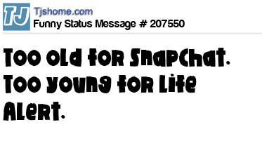 - # 171413 Too old for snapchat and too young for Life Alert.
