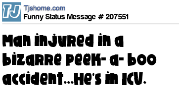 X is Man injured in a bizarre peek- a- boo accident...He's in ICU.