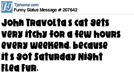 X says John Travolta’s cat gets very itchy for a few hours every weekend, because it’s got Saturday Night Flea Fur.