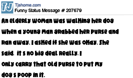X says An elderly woman was walking her dog when a young man grabbed her purse and ran away. I asked if she was okay. She said, “it’s no big deal really, I only carry that old purse to put my dog’s poop in it.”