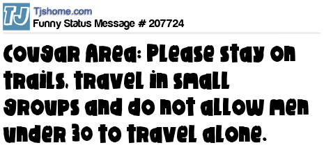 X says Cougar Area: Please stay on trails, travel in small groups and do not allow men under 30 to travel alone.