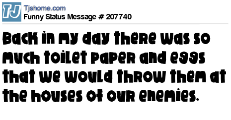 - # 207965 Back in my day we had so much toilet paper and eggs that we would throw them at the houses of our enemies.