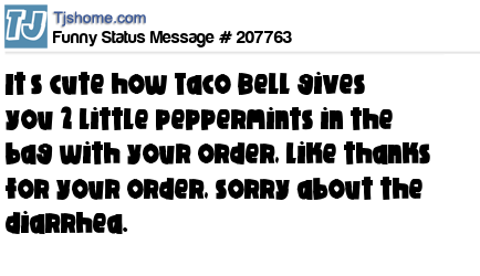 X says It’s cute how Taco Bell gives you 2 little peppermints in the bag with your order, like thanks for your order, sorry about the diarrhea.