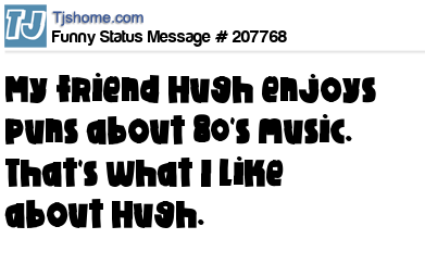 X says My friend Hugh enjoys puns about 80's music. That's what I like about Hugh.