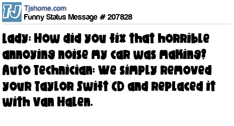 X says Lady: How did you fix that horrible annoying noise my car was making? Auto Technician: We simply removed your Taylor Swift CD and replaced it with Van Halen. ๐