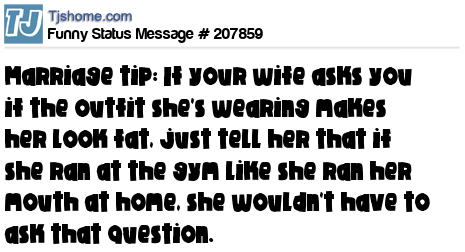 - # 208218 Marriage tip 101: If your wife asks you if the dress she's wearing makes her look fat, just tell her that if she ran at the gym just like she runs her mouth at home, she wouldn't have to ask that question.