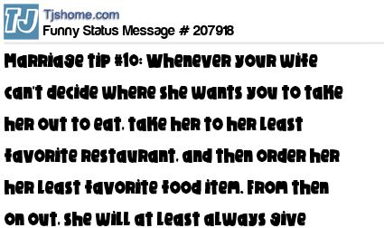 X is Marriage tip #10: Whenever your wife can't decide where she wants you to take her out to eat, take her to her least favorite restaurant, and then order her her least favorite food item. From then on out, she will at least always give you an option.