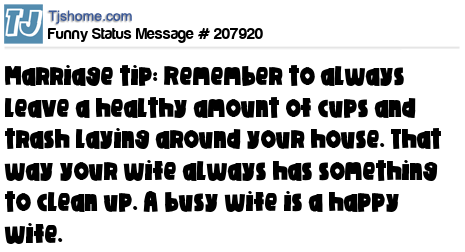 - # 202095 Marriage tip #12: Remember to always leave a healthy amount of cups and trash laying around your house. That way your wife always has something to clean up. A busy wife is a happy wife.