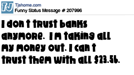 X says I don’t trust banks anymore. I’m taking all my money out. I can’t trust them with all $23.56.