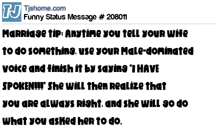 X is Marriage tip: Anytime you tell your wife to do something, use your Male-dominated voice and finish it by saying "I HAVE SPOKEN!!!" She will then realize that you are always right, and she will go do what you asked her to do.