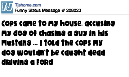 X says Cops came to my house, accusing my dog of chasing a guy in his Mustang ... I told the cops my dog wouldn't be caught dead driving a Ford