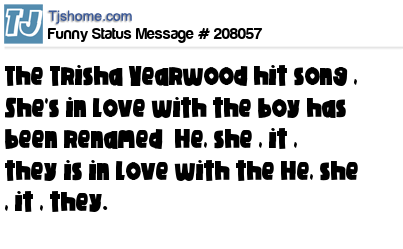 X says The Trisha Yearwood hit song , She's in love with the boy has been renamed He, she , it , they is in love with the He, she , it , they.