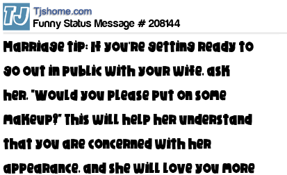 - # 207913 Marriage tip: Your wife values honesty. So if your wife asks you if her best friend is prettier than her, just say "yes". Your wife will value and appreciate your opinion, and she will love you more for it.