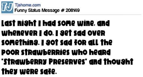 X says Last night I had some wine, and whenever I do, I get sad over something. I got sad for all the poor strawberries who heard "Strawberry Preserves" and thought they were safe.🍓
