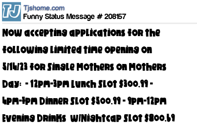 X says Now accepting applications for the following limited time opening on 5/14/23 for Single Mothers on Mothers Day: - 12pm-3pm Lunch Slot $300.99 - 4pm-7pm Dinner Slot $500.99 - 9pm-12pm Evening Drinks w/Nightcap Slot $800.69 Military discounts available
