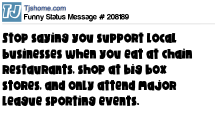 X says Stop saying you support local businesses when you eat at chain restaurants, shop at big box stores, and only attend major league sporting events.