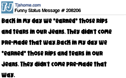 X says Back in my day we *earned* those rips and tears in our jeans. They didn't come pre-made that way.Back in my day we *earned* those rips and tears in our jeans. They didn't come pre-made that way.