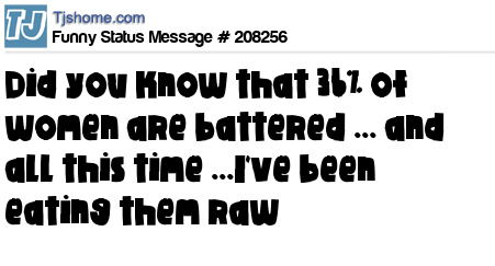 - # 121382 They say 9 out of 10 women are battered, and here I am still eating mine plain