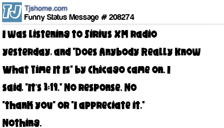 X says I was listening to Sirius XM radio yesterday, and "Does Anybody Really Know What Time It Is" by Chicago came on. I said, "It's 3:19." No response. No "thank you" or "I appreciate it." Nothing.