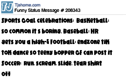 X says Sports Goal celebrations: Basketball: so common it’s boring. Baseball: HR gets you a high-5 Football: endzone tik tok dance so teeny bopper GF can post it Soccer: run, scream, slide, tear shirt off