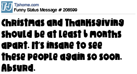 X is Christmas and Thanksgiving should be at least 6 months apart. It's insane to see these people again so soon. Absurd.