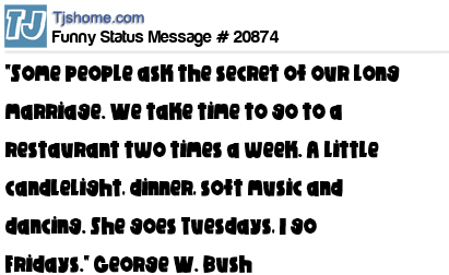 X says "Some people ask the secret of our long marriage. We take time to go to a restaurant two times a week. A little candlelight, dinner, soft music and dancing. She goes Tuesdays, I go Fridays." George W. Bush