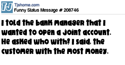 - # 209165 I told the bank manager that I wanted to open a joint account. He asked who with? I said, "The customer with the most money".
