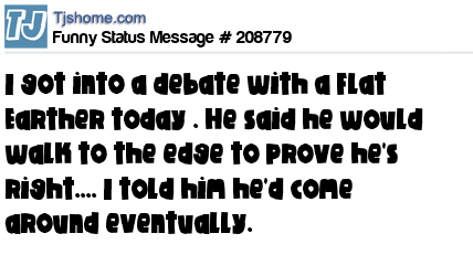 X says I got into a debate with a Flat Earther today . He said he would walk to the edge to prove he's right.... I told him he'd come around eventually.
