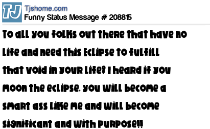 X is To all you folks out there that have no life and need this Eclipse to fulfill that void in your life? I heard if you moon the eclipse, you will become a smart ass like me and will become significant and with purpose!!