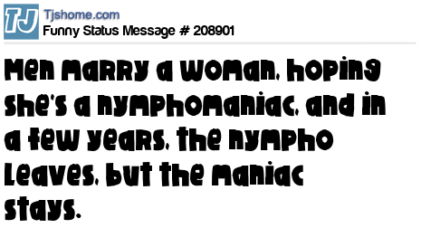 - # 89803 Every man hopes to marry a nymphomaniac; but in many marriages, after a few years the nympho leaves, but the maniac stays.