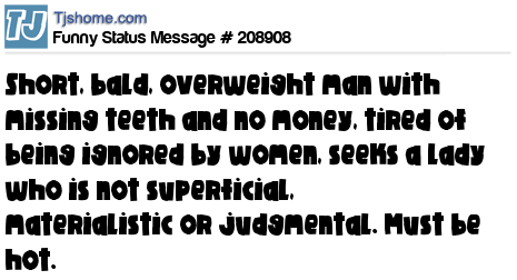 X says Short, bald, overweight man with missing teeth and no money, tired of being ignored by women, seeks a lady who is not superficial, materialistic or judgmental. Must be hot.