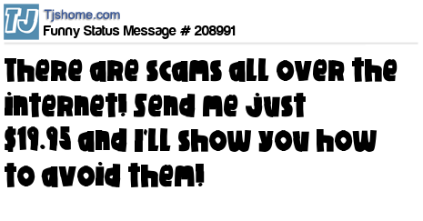 - # 105492 There are so many scams on the Internet now... Send me $19.95 and I will tell you how to avoid them.